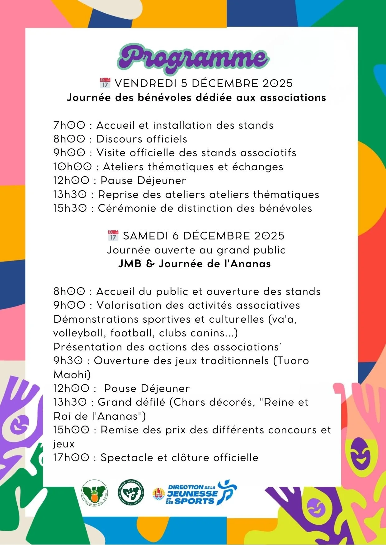 La Direction de la Jeunesse et des Sports organise une édition inédite de la Journée Mondiale du Bénévolat en partenariat avec le Comité du Tourisme de Moorea. Deux journées exceptionnelles vous attendent à la plage de Ta'ahiamanu : une première journée dédiée au monde associatif le 5 décembre, suivie d'une grande fête ouverte à tous le 6 décembre fusionnant célébration du bénévolat et Journée de l'Ananas.